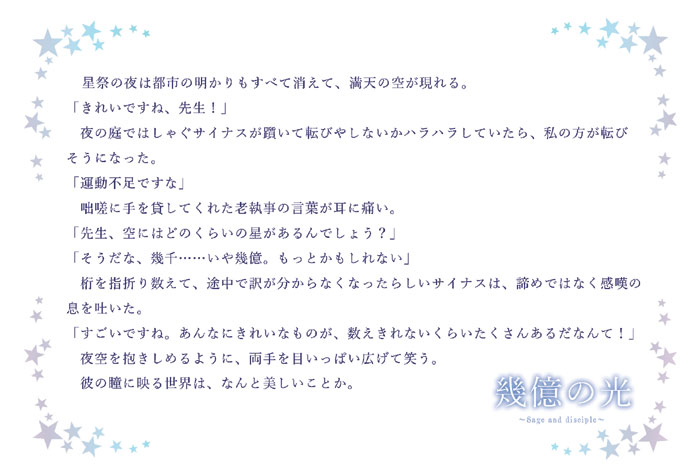最後の「幾億の光」は、イベント5日前に、またツイッターで「置く」→「億」の変換ミスをしまして(/_;)、急遽ポストカードにして無料配布した300字SSです。