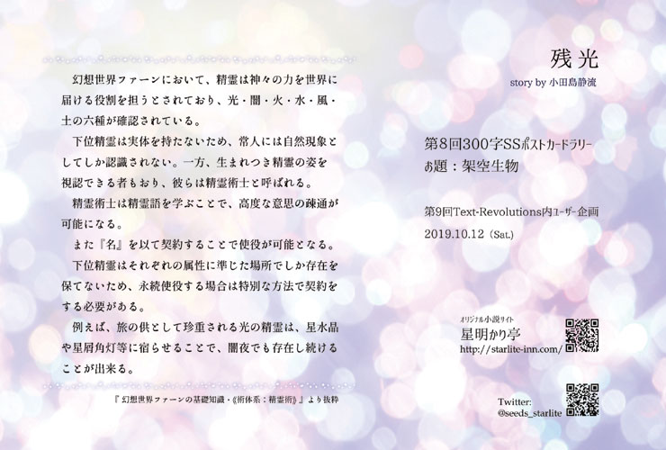 残念ながら、配布予定だったテキレボ9は台風接近のため開催中止となりましたが、こちらの「300字SSポストカードラリー」は企画主宰様のご尽力により、「遠隔300字SSポストカードラリー」として期間限定・通販による疑似ラリーとして開催される運びとなりました。