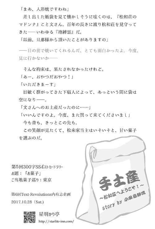 こちらは第6回 Text-Revolutions内有志企画「300字SSポストカードラリー」参加作品「手土産」の裏面。
