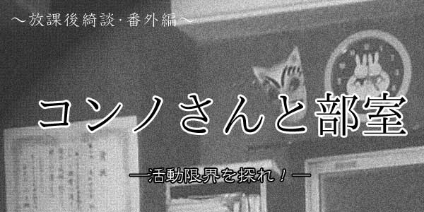 次の瞬間、部室の窓の上、キャラクター時計の隣に白い狐のお面が姿を現わす。これこそが、コンノさんの本体。誰が持ち込んだとも分からない、謎の狐面だ。